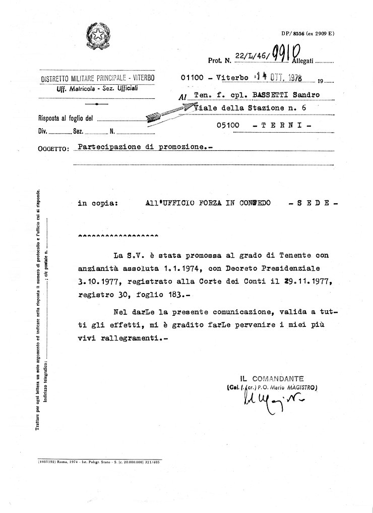 Diplomatomi in Elettronica all'ITIS di Terni nel giugno 1967, feci presto domanda di ammissione ad un corso Ufficiali dell'Esercito. Nell'ottobre fui chiamato per la selezione in un ufficio a Roma in una traversa di via Firenze nel retro dei palazzi dello Stato Maggiore della Difesa (ingresso principale in Via XX Settembre). Dopo le visite mediche e gli esami psico attitudinali un Colonnello mi disse: "Data la sua ottima preparazione in elettronica può essere assegnato alle Trasmissioni". Mercoledì 24 aprile 1968, mentre stavo lavando l'autovettura, il postino mi consegnò la cartolina precetto che mi intimava di presentarmi alla caserma Ferrari Orsi di Caserta il giorno 25 aprile. Superata l'inattesa sorpresa e verificato che il 25 aprile era il giorno seguente, salutai i miei genitori e partii in treno per Caserta. Giunto faticosamente in caserma trovai solo il picchetto e l'Ufficiale perché avevo dimenticato, come chi mi scrisse, che il 25 Aprile è festa nazionale, quindi libere uscite straordinarie, permessi e licenze. Da solo girai in senso orario tutte le casermette: Cavalieri (Bricchetto, Carristi (Klisura), Fanti Meccanizzati e Lagunari (Mareth), senza trovare riscontro. L'ultima casermetta era quella dei Bersaglieri e lì trovai un piantone (oggi Colonnello Anacleto Romano) che mi disse che mi aspettavano e che ero in ritardo. Dopo la vestizione, non proprio su misura, il 26 iniziai il pesante addestramento poi diventato piacevole alla Scuola Truppe Meccanizzate e Corazzate (Gen. Giangiorgio Barbasetti di Prun) 2° Reparto Corsi (Col. Attilio Ferrari), XII Battaglione (Ten. Col. Giuseppe Carrubba), 1° Compagnia Bersaglieri Bir el Gobi (Cap. Gian Franco Svorinich). In ottobre, conseguito il grado di Sergente Allievo Ufficiale fui trasferito al 3º Reggimento Fanteria corazzato Granatieri di Sardegna (Ten. Col. Colucci) LXVII Btg. Bersaglieri Ciclisti, oggi su VTT M113, CCS Trasmissioni caserma “Guido Cucci" (Cap. Conte). Martedì 7 Gennaio 1969 fui assegnato al 1° Reggimento Bersaglieri di Aurelia-Civitavecchia, caserma Col. Lorenzo D'Avanzo, come Ufficiale di prima nomina presso la CCS Trasmissioni poi trasferito dall'allora Colonnello dei Granatieri di Sardegna Gianfranco Maria Chiti (poi frate cappuccino di cui oggi è in corso il processo di beatificazione) comandante pro-tempore del 1° Reggimento della Divisione Granatieri di Sardegna sostituito poi dal Col. Cesare Quagliardi alla compagnia Contro Carri (Cap. Alberto Scotti). Dopo varie esperienze fui retroattivamente promosso al grado di Tenente Comandante di Reparto il 3 Ottobre 1977, con anzianità assoluta 1 Gennaio 1974, dal Presidente della Repubblica Giovanni Leone, registrato alla Corte dei Conti il 29 novembre 1977 registro 30, foglio 183. Il 25 novembre 1985 venni collocato nella Riserva dove sono tutt'oggi alla tenera età bersaglieresca di 20 anni (x 3,5).